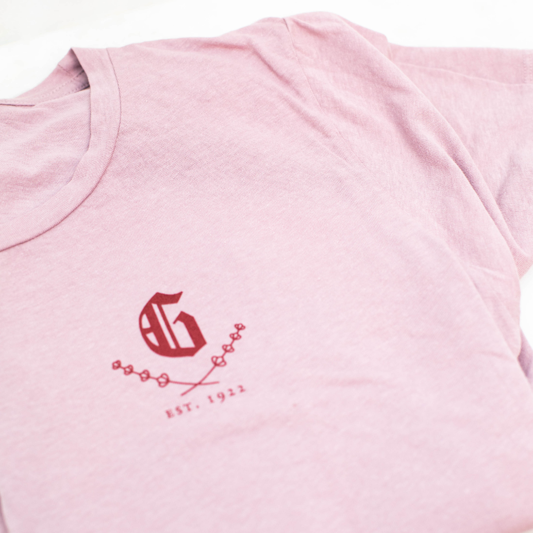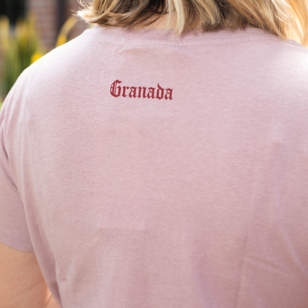 Granada's 'G' logo is screen-printed in burgundy on the left chest, and the full logo is screen-printed on the back below the neckline.